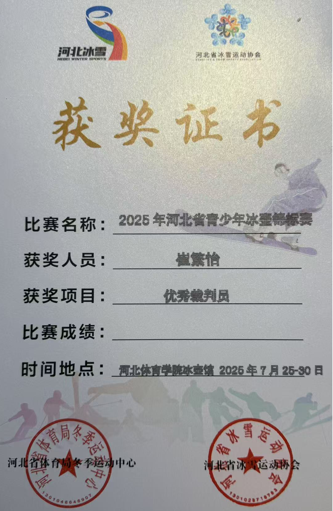 2025年7月30日在河北体育学院圆满落幕的河北省青少年冰壶锦标赛上,传来喜讯—— 石家庄金融职业学院的崔繁怡老师凭借出色的执裁表现,荣获“优秀裁判员” 称号,为学院赢得了荣誉。